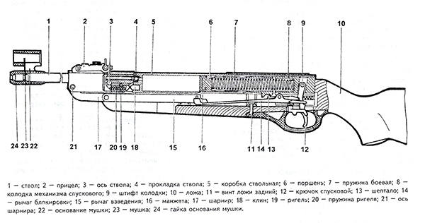 Пружинно-поршневая винтовка Ижевского завода имеет простую конструкцию. Основные элементы: