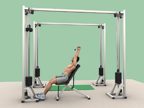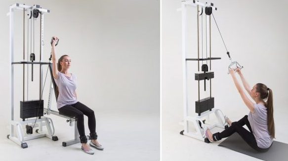 Использование тренажера окажется максимально полезным для шеи. Упражнение для этой части тела выполняется довольно просто. Достаточно пристегнуть трос к карабинам и встать по центру, ноги разместить на ширине плеч. В таком положении необходимо выполнять жим над головой. Изначально при этом ручки эспандера должны находиться рядом с плечами.