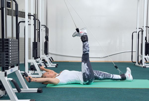Для тренировки мышц ног в домашних условиях зафиксируйте трос в верхнем положении и прикрепите второй конец к манжете на ногах. Выполняйте упражнение сидя, лицом к стене, отводя ногу в сторону. Достигнув максимальной точки, сделайте паузу, затем вернитесь в исходное положение.