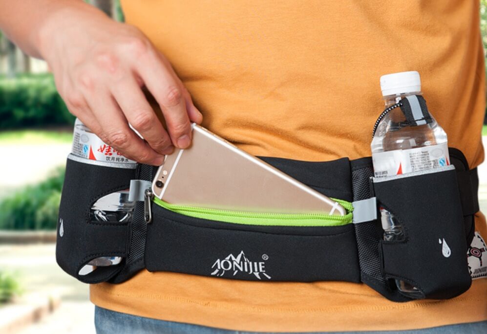 Сумка на пояс (женская или мужская) фиксируется специальными регуляторами в области талии. Из всех вариантов она отличается наибольшей вместительностью, но при этом остается компактной и легкой, вес содержимого распределяется равномерно. Дополнительно в комплект может входить бутылка для воды. Причем крепление специально предназначено именно для данной модели, поместить туда иную емкость будет проблематично.