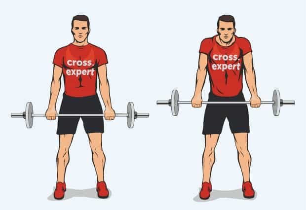 | Шраги со штангой узким хватом | Штанга держится узким хватом. | Более сильный акцент на среднюю часть трапециевидных мышц. |