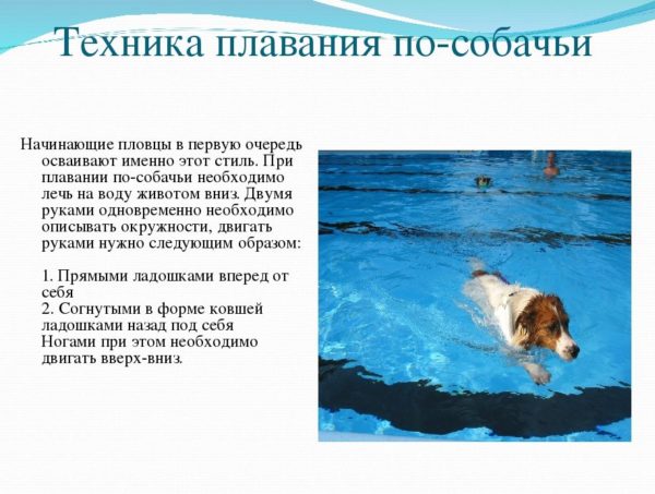 У этого стиля нет официального названия. Это метод, который интуитивно выбирает почти каждый, кто впервые оказывается в воде и пытается удержаться на плаву. Профессиональные пловцы его не используют, так как собачий стиль слишком медленный, но он подходит для обучения. Полезно применять доску для плавания, чтобы отработать движения ног.