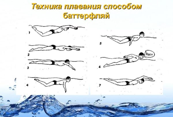 Второе название — дельфин. Это сложная техника плавания, требующая координации, мышечной силы и выносливости. Существует несколько разновидностей: