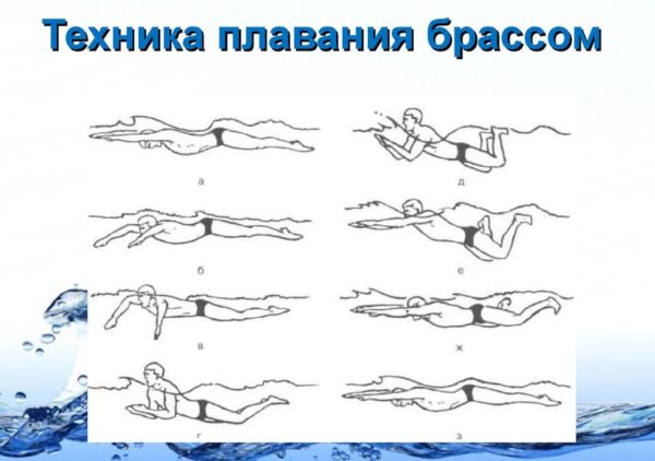 | Брасс | Одновременные движения рук вперед и вниз под водой, «лягушачий» толчок ногами. Голова находится над водой большую часть времени. | Энергоэффективный на коротких дистанциях, хорошая видимость. Медленный по сравнению с кролем. |