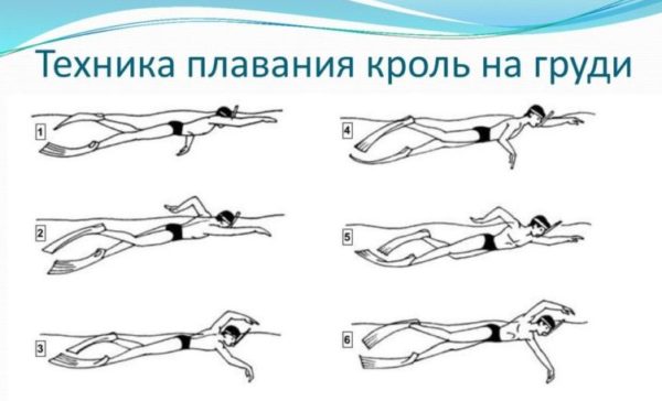 Кроль на груди еще называют вольным стилем. Он позволяет развивать на воде большую скорость без сильного напряжения. С него начинают подготовку новички. Спортсмен плывет «лежа» грудью на воде. Руки движутся одна за другой параллельно телу, ноги совершают вертикальные движения по типу ножниц. Когда одна рука уходит назад, в эту же сторону поворачивают голову и делают вдох. На выдохе лицо погружено в воду. Количество гребков между вдохами может быть разным — зависит от тренированности человека и его задач. Плавание в бассейне кролем хорошо сжигает жир, подтягивает фигуру, но не позволяет расслабляться и отдыхать во время движения.