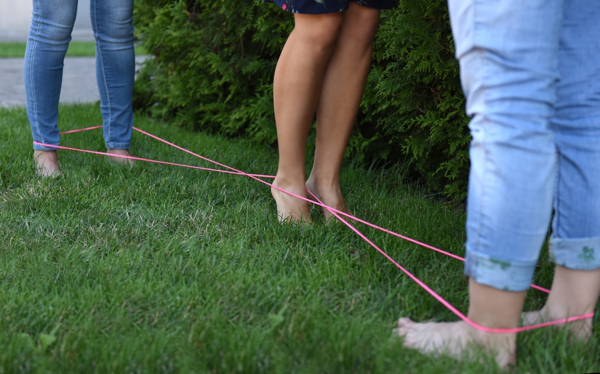 Ключевое условие — резинка должна оставаться плотно прижатой к земле. Если она выскочит из-под ног, задание не выполнено и его нужно повторить. Для упрощения на более сложных уровнях можно просто ходить, наступая на резинку.