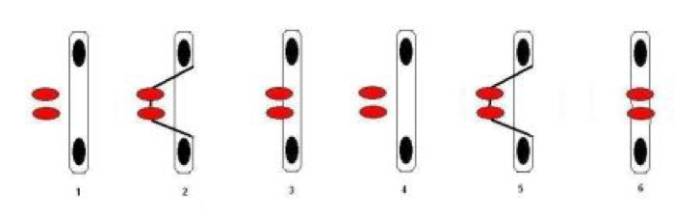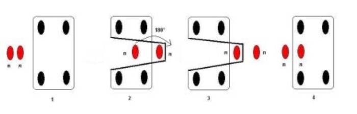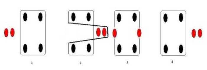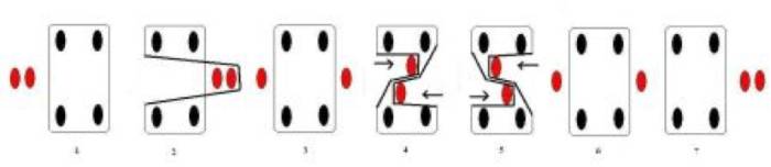 После этого игрок возвращается в исходное положение. Он снова аналогичным образом оттягивает на себя дальнюю часть резинки и прижимает ее обеими стопами. Однако на этот раз при прыжке важно приземлиться одновременно на две резиновые полоски (двумя ногами вместе).