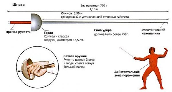 Шпага – колющее холодное оружие, по конструкции очень похожее на рапиру. В отличие от рапиры у шпаги более жесткий клинок (трехгранное сечение), и она на 270 грамм тяжелее. Гарда, защищающая руки спортсмена, равна 13,5 сантиметров в диаметре.