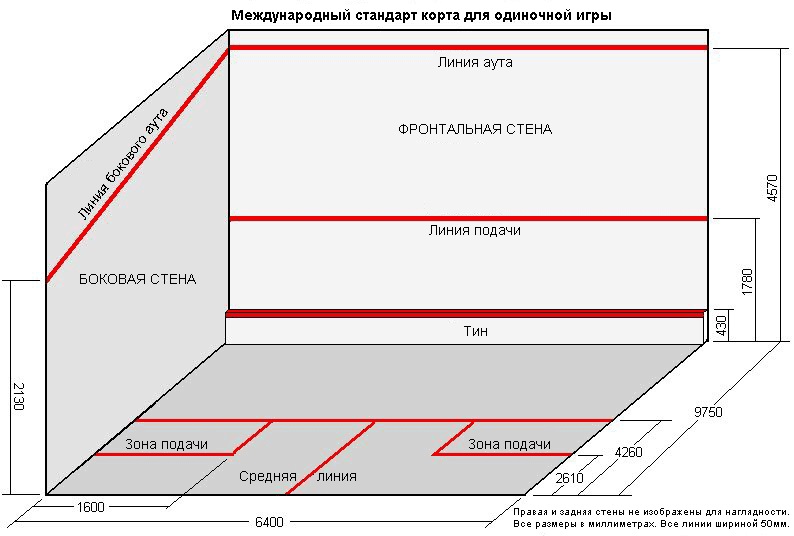 | Размер корта | Длина: 9,75 м; Ширина: 6,4 м; Высота: 4,57 м (стандартный) | Игра невозможна |