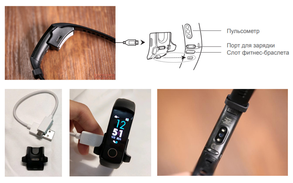 На нижней стороне браслета расположены датчики пульса и контакты для зарядки. Устройство водонепроницаемое, что позволяет использовать его в бассейне, где оно также определяет скорость плавания и стиль.