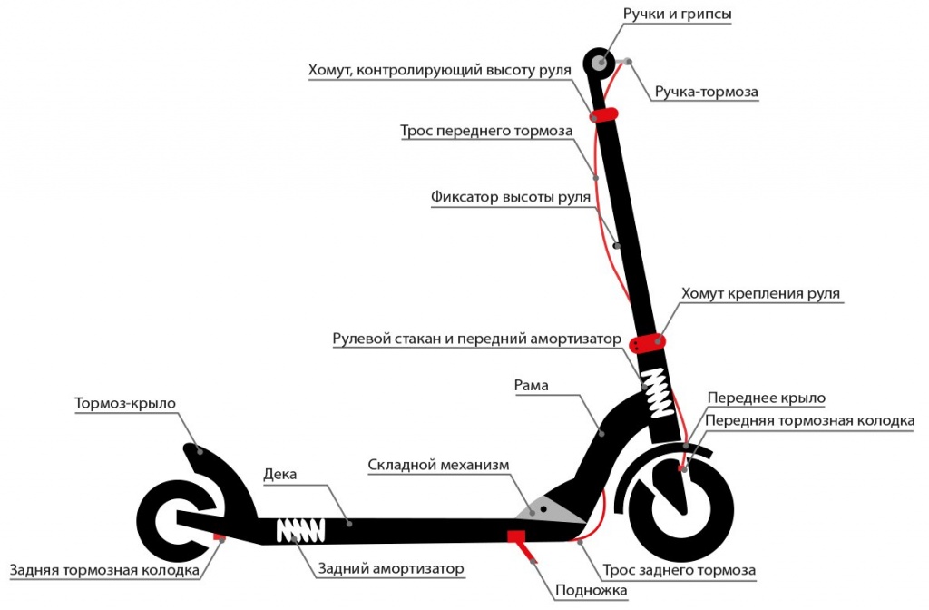 - Тормозная система. Большинство самокатов используют ножной тормоз, активируемый нажатием на заднее крыло. Есть модели с ручным тормозом, управляемым с руля и соединенным с тормозными колодками спереди и сзади.