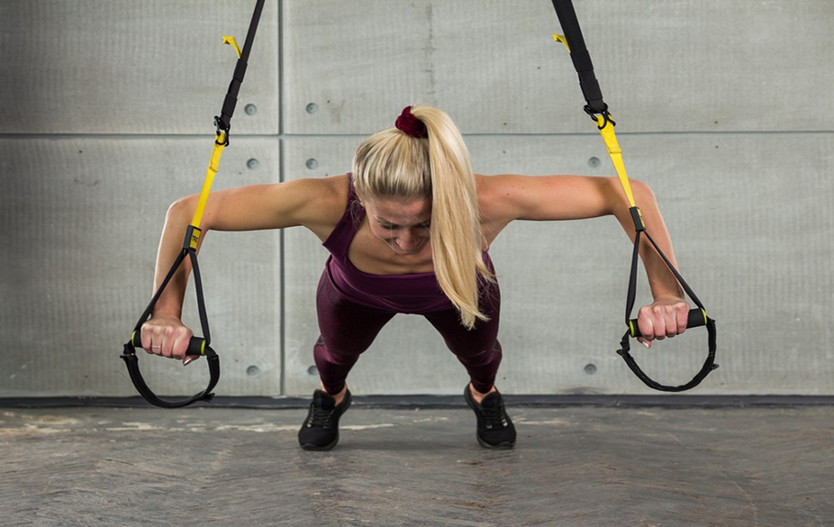 - Отжимания. Корпус наклоняют вперед, находят баланс на распрямленных руках с петлями. Локти сгибают, приближают тело к рукоятям и возвращают в исходную позицию. Изменение угла или положения рук вовлекает бицепсы или трицепсы. Модификацию усложняют за счет наклона корпуса вперед, узкой постановки ступней или стойки на одной ноге.