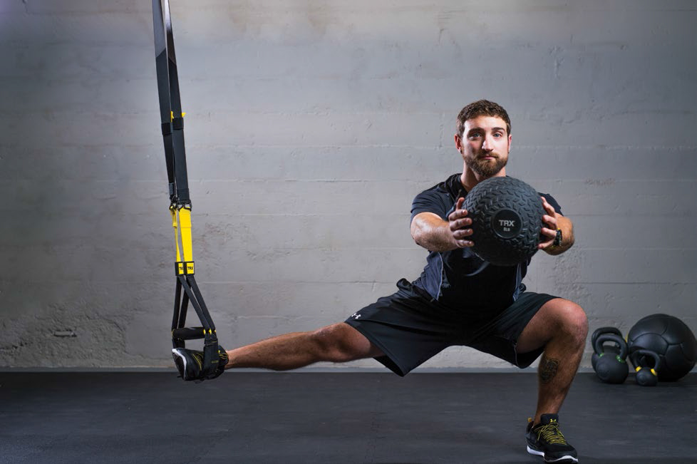 - Выпады. С низким креплением ремней — когда одна нога согнута в колене и находится в петле. Упражнение с высоким подвесом разнообразят, меняя сложность. Одна из вариаций — смена ног в прыжке (плиометрические выпады) без касания пола второй ногой (с балансом) или движениями по диагонали.