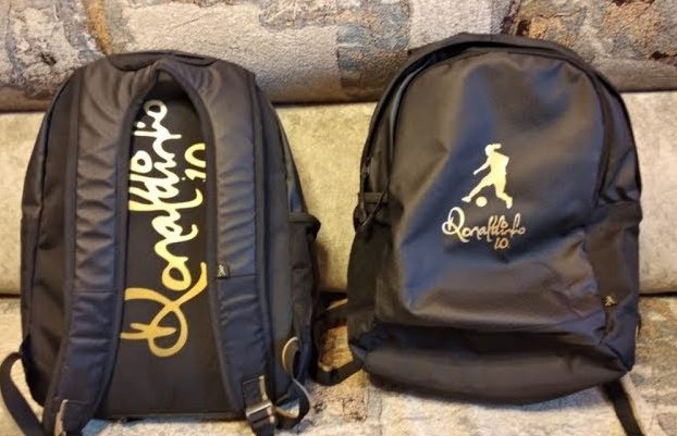На внешней стороне рюкзака расположена золотая вышивка с логотипом. При внимательном рассмотрении можно увидеть фигуру Роналдо и его подпись. На стороне, обращенной к спине, также имеются принты — большая золотая подпись и номер игрока, которые повторяются на подкладке.
