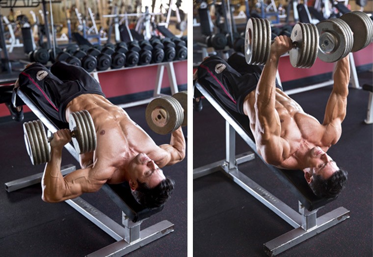 В зависимости от угла наклона, распределяется нагрузка, которая и способствует более сильной работе той или иной группы мышц. Если жим будет на наклонной скамье под углом 30 градусов, то накачается верх и центр груди. Наклон на 45 градусов нагружает верх, освобождая середину. Жим при 60 градусах перекладывает нагрузку на трицепсы, переднюю часть дельтовидных мышц и верх грудных. Если делать упражнение вниз головой, то проработаются мышцы нижней части груди.