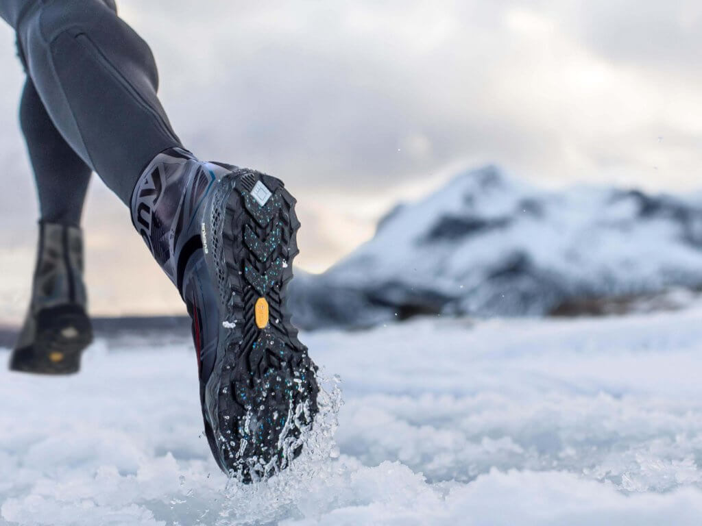 Преимущество встроенных шипов — кроссовки хорошо выдерживают длительные тренировки на заснеженной местности (от 1,5 часов и более).