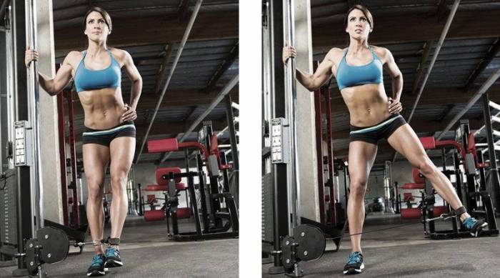 Наиболее эффективное из всех упражнений с отведением ног на кроссовере. Во время тренировки задействована больная ягодичная мышца и дополнительно прорабатывается задняя поверхность бедра. При соблюдении правильной техники за небольшие сроки можно придать ягодицам прекрасный вид