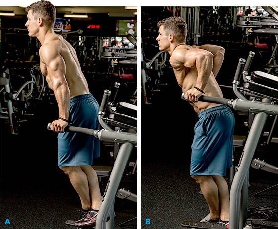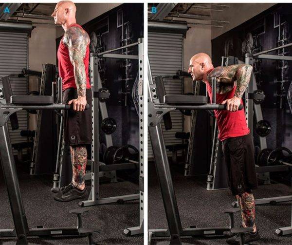 - Отжимания на брусьях с отведением локтей назад — 3 подхода.