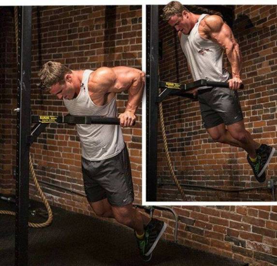 Традиционно отжимания на брусьях выполняются для развития трицепсов. Для упражнения понадобятся брусья, расстояние между которыми немного превышает ширину плеч. Необходимо запрыгнуть на них, используя хват с положением ладоней к туловищу. Далее выполняются такие действия: