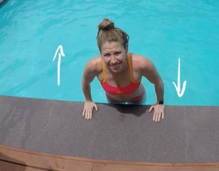 Начните выполнять упражнение для похудения рук в мелкой части бассейна, положите ладони на верхнюю ступеньку лестницы, ступни должны упираться в дно бассейна. Медленно сгибайте руки в локтях и делайте отжимания, следите, чтобы лицо не погружалось в воду. Разогните локти и повторите упражнение.