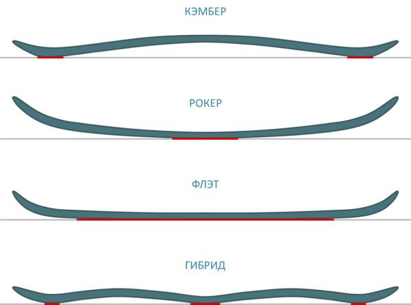 Правильный подбор прогиба сноуборда влияет на простоту управления доской. Классическая версия называется Camber. У нее приподнятый центр, под весом спортсмена давление равномерно распределяется по всей площади доски. Подобные модели не подходят для обучения.