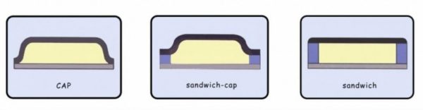 - «Сэндвич». Все три элемента конструкции опрессованы под давлением. Получается многослойная система повышенной прочности. «Сэндвичи» дороже «кэпов», реже ломаются, но и в ремонте сложнее.