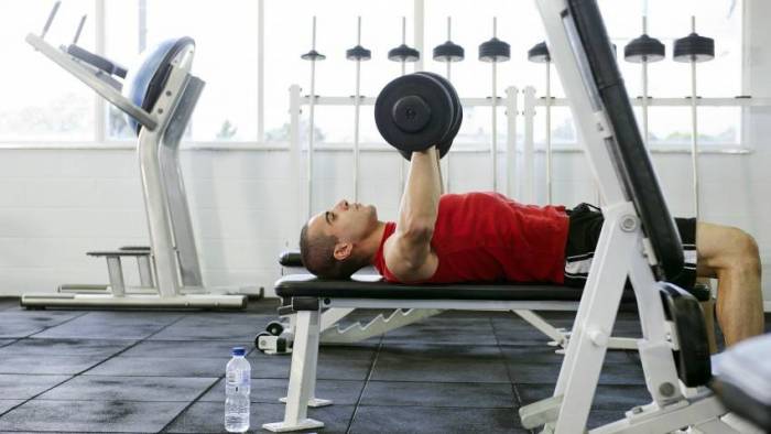 - если поднимать гантели не выше уровня плеча – на верх грудных мышц;