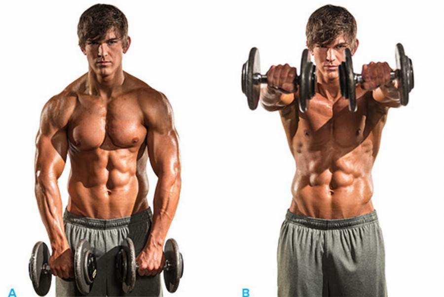 Сделайте глубокий вдох и выдыхая поднимите гантель впереди себя до уровня глаз, при этом локоть в верхней точке должен находится не ниже уровня ваших плеч, иначе теряется эффективность всего движения. Когда гантели поднимутся подниматься до уровня плеч, их следует до конца движения немного смещать во внутрь, усиливая изолированную нагрузку на тренируемую мышцу.
