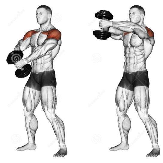 В верхней точке не следует задерживаться, а достигнув пика сокращения переднего пучка дельт, возвращайтесь в исходное положение, не допуская касания гантели до квадрицепса.