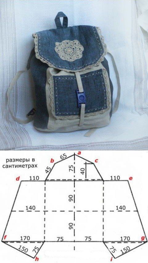 Если мастерица не знает, как сшить рюкзак из джинсов своими руками, выкройка подскажет последовательность действий. Из старых брюк можно изготовить оригинальную модель без дна с удлиненной передней половиной. Зауженная спинка имеет округлую форму посередине, очертания лицевой части напоминают широкий полумесяц. Изделие закрывается на цельный клапан, свободно ниспадающий вниз. Бретели можно сделать из джинсы, или, если ткани не хватит, пришить вместо лямок декоративный шпагат. Для удобства переноски к верху изделия крепится широкая прочная петля.