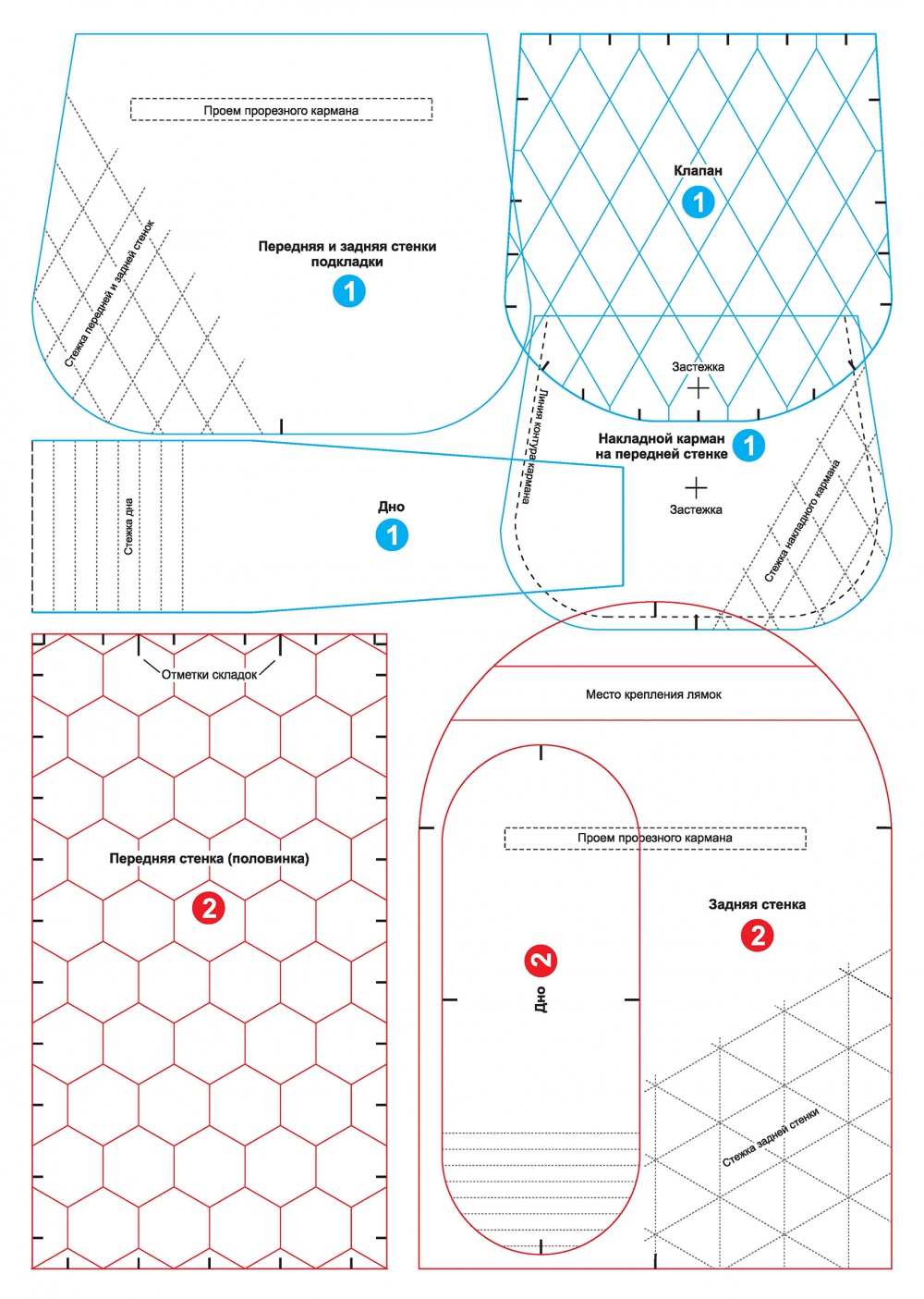 | 3. Построение основы передней детали | Построение симметричной или асимметричной детали (в зависимости от модели) с учетом наличия карманов, клапанов и других элементов. | Для рюкзаков с накладными карманами – построение выкроек карманов. Для рюкзаков с клапаном – построение выкройки клапана. |