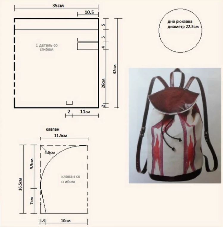 Для пошива надо совместить по оси нижнюю часть с полукруглой деталью. Далее верхушка затягивается, сверху помещается клапан. Лямки крепятся к спинке с обеих сторон. Выкройки рюкзаков с размерами для такой модели изготовляются из большого куска полотна.