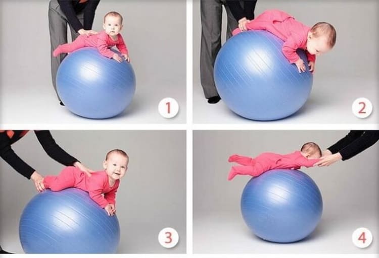 С возрастом ребенка упражнения становятся сложнее. В 5–6 месяцев он может «бегать» по фитболу, если мама поддерживает его под мышки. Позже можно усаживать малыша на мячик, слегка покачивая его. Комплекс упражнений обязательно согласовывается с педиатром, который наблюдает за развитием ребенка.