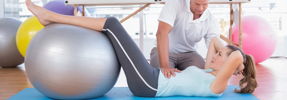- Сидя на мяче, выполняет повороты туловища. При этом женщина пытается дотянуться до противоположной ноги.