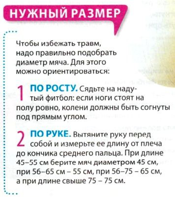 Чтобы занятия с фитболом приносили пользу, важно правильно выбрать мяч. Мячи для беременных должны соответствовать определённым критериям. В первую очередь, оцените комфорт сидения на мяче. Определить подходящий размер просто: сядьте на мяч. Если колени сгибаются под углом 90 градусов, а стопы стоят на полу, мяч подходит. Учитывайте также рост: