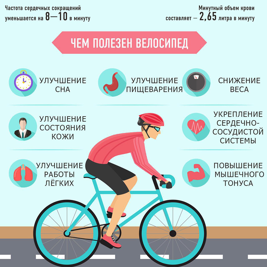 Сбалансированное питание и регулярные велопрогулки помогут избавиться от лишних килограммов и укрепить здоровье. Физические нагрузки улучшают кровообращение, очищают легкие и нормализуют работу сердечно-сосудистой системы. Дополнительные преимущества:
