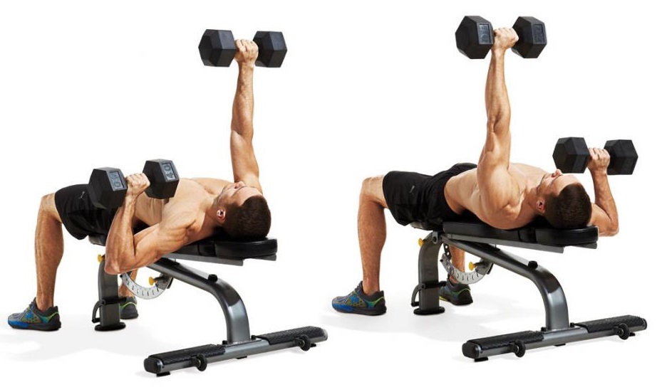 Жим гантелей лёжа на наклонной скамье. Это упражнение по праву можно считать лучшим для верхней части грудных мышц, которое выполняется на наклонной скамье под углом 30° и 45°, задействуя трицепс и дельты (значительно больше, чем в упражнении на прямой скамье).