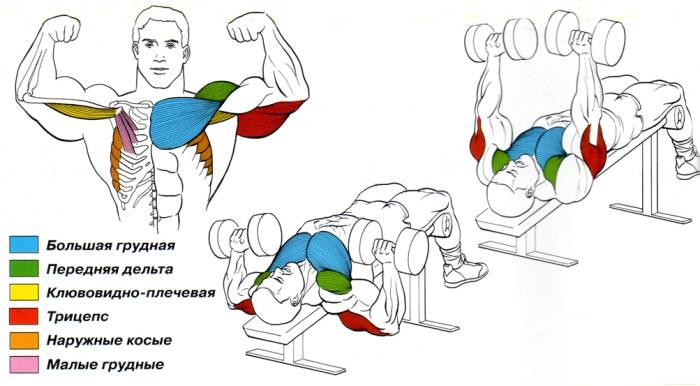Основную нагрузку жим гантелей дает большой и малой грудным мышцам. Она «смещается», если поменять положение корпуса: