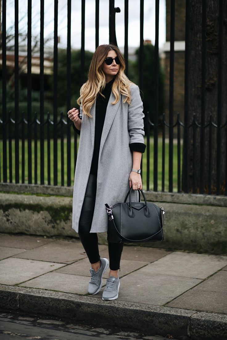 Модники часто задаются вопросом, как сочетать серые кроссовки. Эта обувь отлично смотрится с спортивной, деловой и джинсовой одеждой. Кроссовки гармонируют с верхней одеждой прямого кроя, такой как пальто оверсайз, кардиганы, меховые жилеты и удлиненные жакеты. Вот несколько удачных сочетаний для женщин: