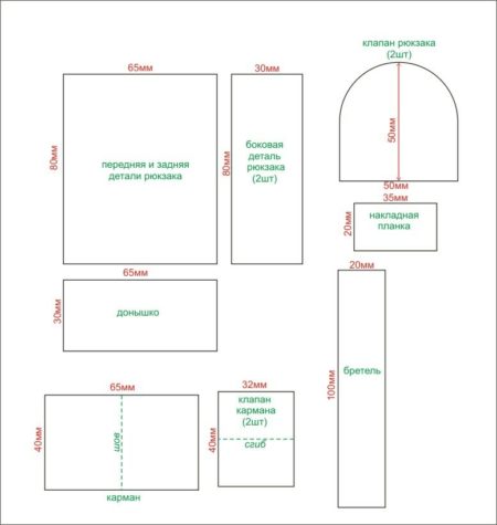 Выкройка рюкзака состоит из трех элементов. Из ткани вырезаются два прямоугольника размером 78 см на 39 см с учетом припусков. Синтепон должен быть такого же размера. Ширина дна — 12 см, длина — 26 см (вырезать 2 детали). Подкладка будет того же размера, что и основа рюкзака.