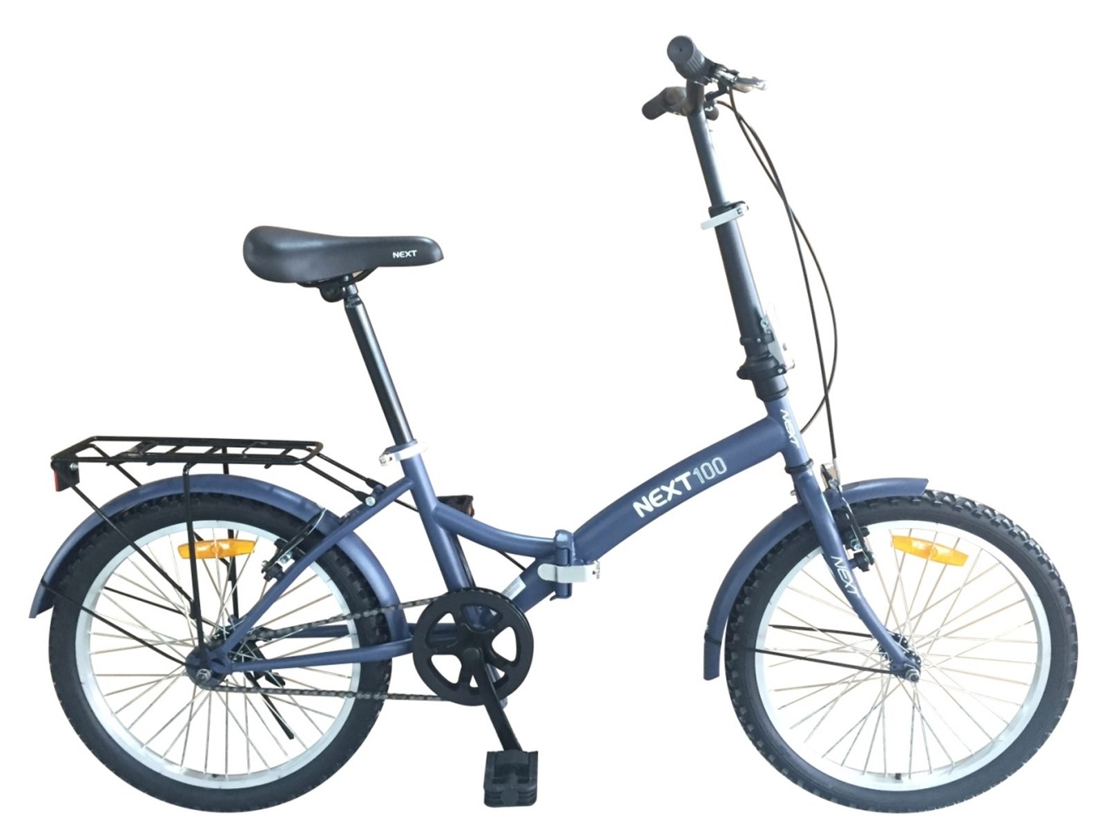 Next 100. Велосипед с прочной стальной рамой и складным рулем, 20-дюймовыми колесами. Идеален для асфальтированных дорог. Оснащен одной скоростью и тормозами v-brake. В комплект входят задний багажник, подножка и звонок.