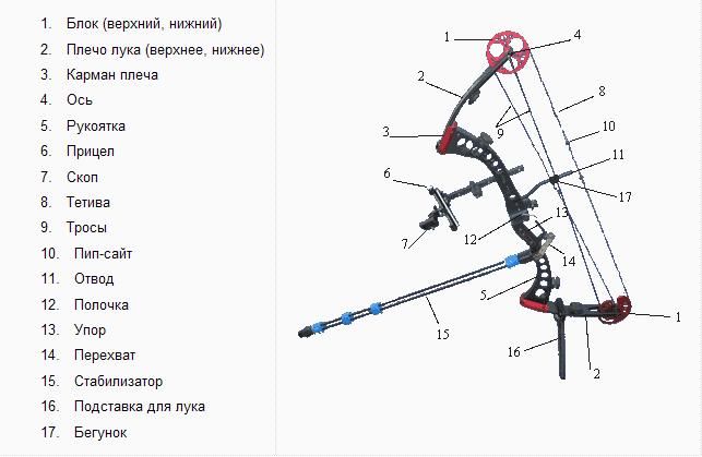 - рукоятка — часть, за которую стрелок держит лук;