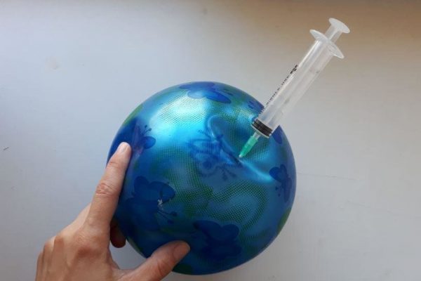 - Набрать в шприц снова воздух и повторять процедуру до тех пор, пока мячик не будет полностью накачан.