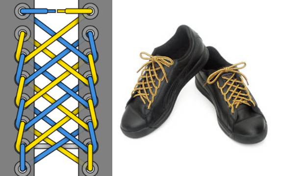 Лучший вариант для тех, кто задается вопросом, как быстро завязать шнурки не только на кроссовках, но и на ботинках, кедах и прочей обуви. Недостаток — способен деформировать любимую пару и порвать дырки, если элементы затянуть слишком туго.