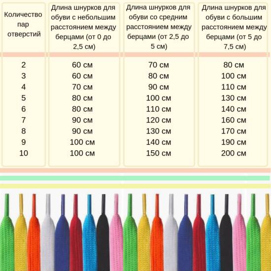 Наиболее удобный способ выбрать длину шнурков — измерить старые или взять их в магазин. Можно также обратиться к консультанту. В качестве ориентира используйте таблицу: