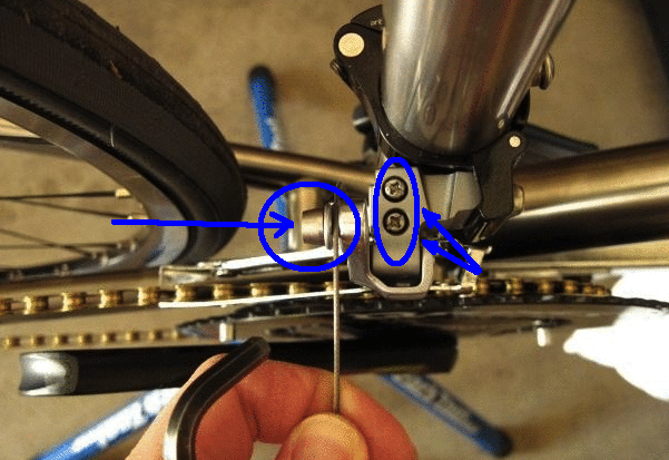 - Винтом, ограничивающим нижние передачи, отрегулировать положение рамки. Она должна быть расположена максимум на 3 мм дальше от цепи.