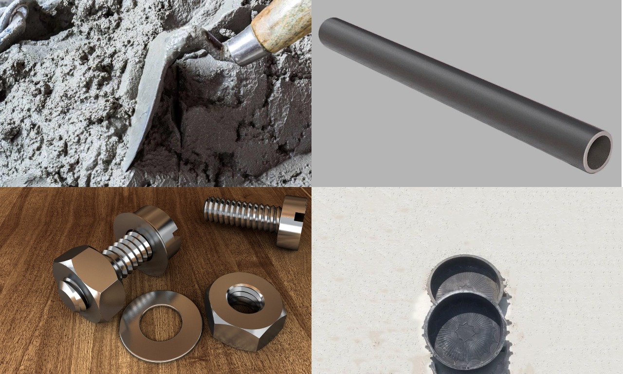 Также подготовьте два отрезка трубы большего диаметра для креплений грифа. На каждом конце должны быть сквозные отверстия для вставки металлической спицы, что обеспечит надежную фиксацию. Когда все элементы готовы, переходите к заливке формы. При заполнении оставьте место для крепления грифа. Установите фиксаторы для ручки и аккуратно заполните форму раствором до конца. После застывания бетона закрутите крепежи и вставьте в них гриф.