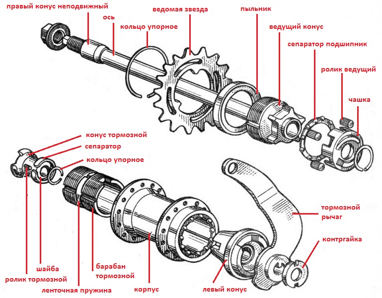 После ремонта важно правильно собрать заднюю втулку велосипеда, следуя обратному порядку разборки. Схема сборки: правые подшипники – ось колеса – конус – левые подшипники – стопор – шайбы и заклепки – контргайка.