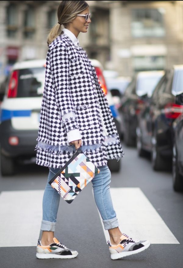 Кроссовки подойдут для модных событий в стиле спорт-шик или casual. Выберите небольшую сумку трапециевидной или прямоугольной формы. Подойдут как однотонные модели, так и с контрастными цветами. Яркие принты и декоративные детали сделают образ более привлекательным и оригинальным.