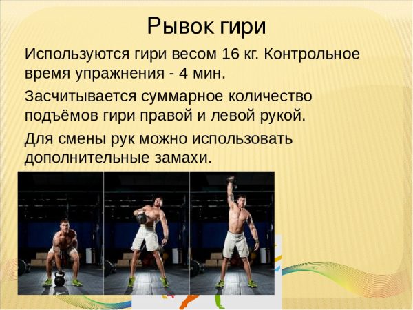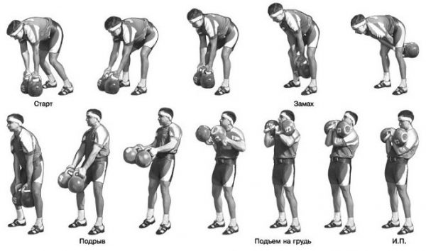 | Подъем гири | Приседание, выпрямление ног с одновременным рывком гири вверх до уровня груди, сохраняя прямую спину. | Приседание, выпрямление ног с одновременным рывком гири вверх до уровня груди, сохраняя прямую спину. |